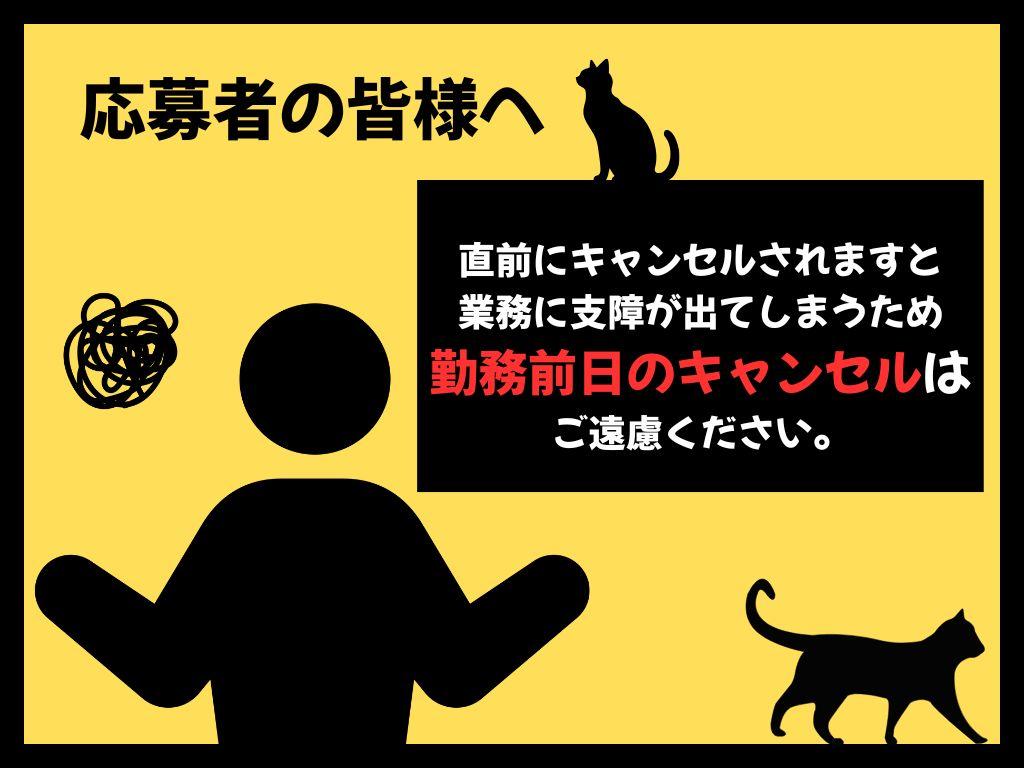 【お願い】 前日や直前のキャンセルはご遠慮ください。 応募いただいた方も含めた人数でシフトを組んでおります。 前日や直前にキャンセルされてしまいますと、 代わりのスタッフも見つけることもできず、人数が足りなくなります。 ご都合はあるかと思いますが、直前のキャンセルはどうかお控えください。 【合流】 集合場所は必ず地図をご確認ください。遅刻は厳禁です。 勤務先に到着しましたら「スポットバイトルで働きにきました」とお伝えください。 入口が分からない、道に迷った場合は緊急連絡先へお電話をお願いします。 万が一遅れる場合には緊急連絡先までお電話ください。 日付や求人内容をよく読んでからのご応募お願いします。 【感染症対策】 起床時に必ず検温を行い、37.5℃を超える場合はすぐにキャンセルをお願いいたします。 【長期勤務希望の方も歓迎しています】