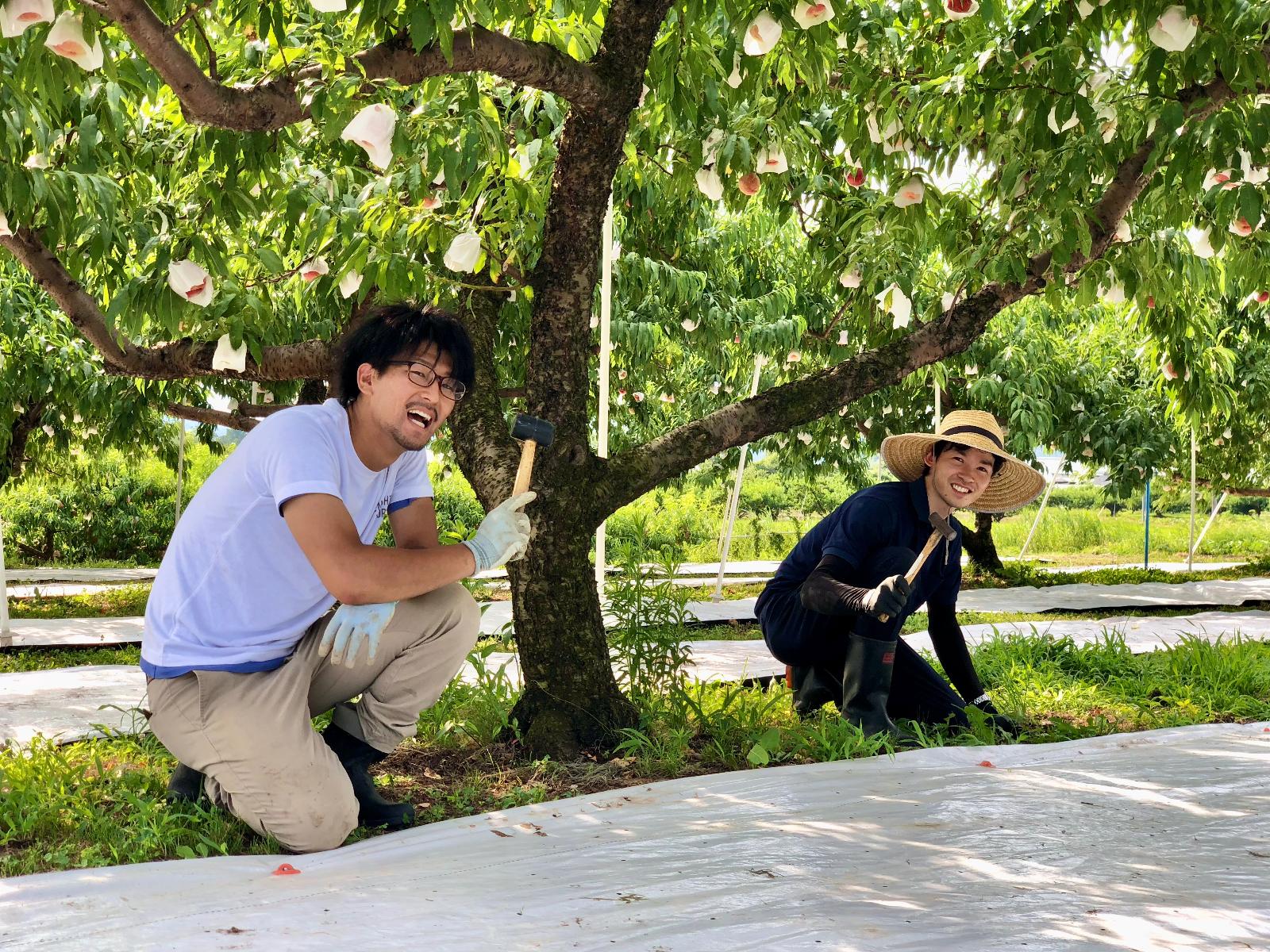 桃畑では、収穫10日前になると桃の色づきをよくするために、反射シートを敷きます。 シートを広げ、ゴムハンマーでペグを打ち付けるお仕事です。 未経験大歓迎です◎ 最初に仕事内容のご説明をさせていただきますのでご安心ください! 手が空いた時や、天候が悪くて外仕事を中断した場合は、他のお仕事をお任せすることもあります。その都度、説明するのでご安心ください! 不明な点はお気軽にお尋ねください!